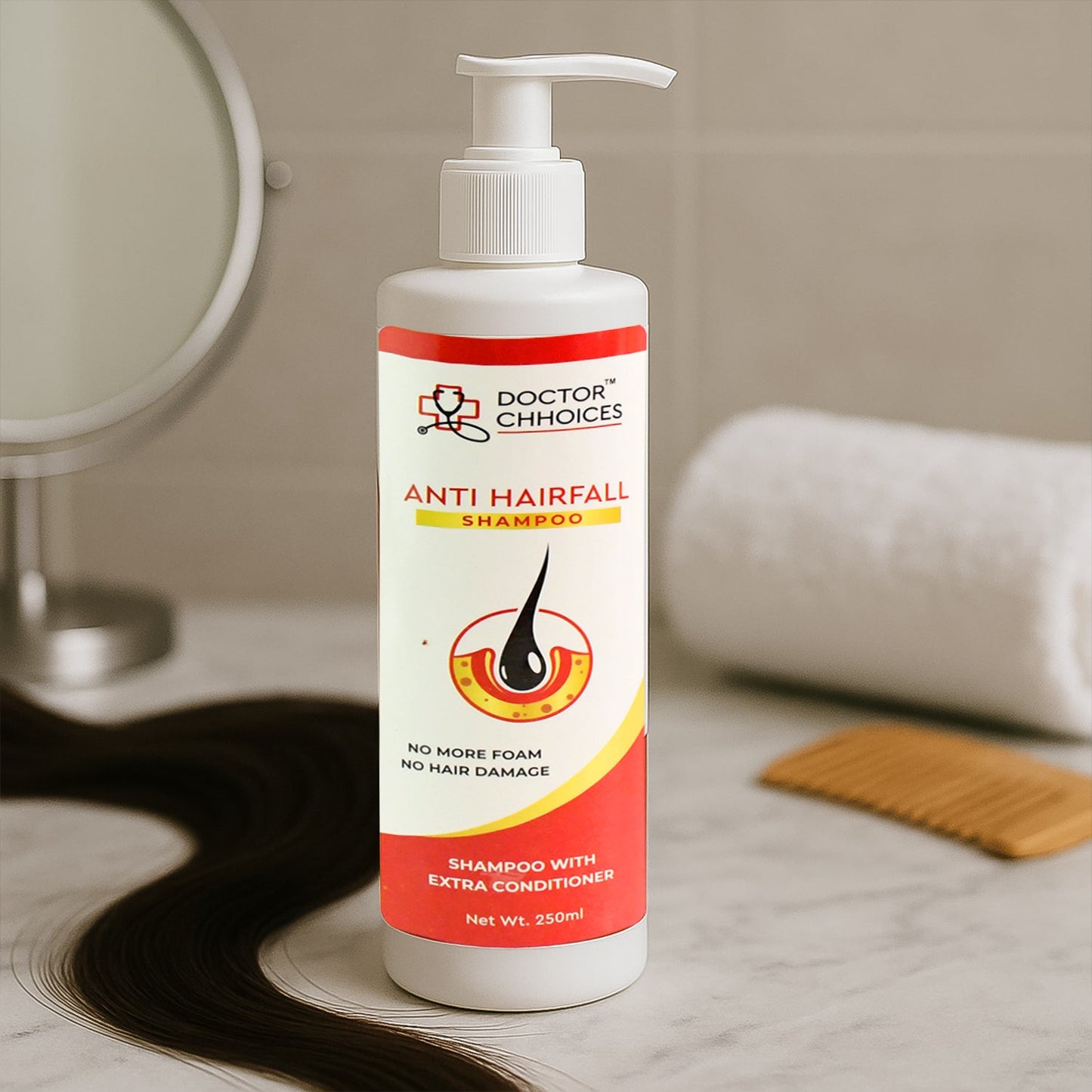Doctor Choices Anti Hairfall Shampoo is a premium herbal formulation designed to reduce hair fall and strengthen the roots. Infused with time-tested natural ingredients like amla, coconut oil, and other nourishing herbs, it deeply conditions the scalp while cleansing impurities. The unique “No Foam, No Damage” formula ensures minimal harshness, making it safe for regular use.