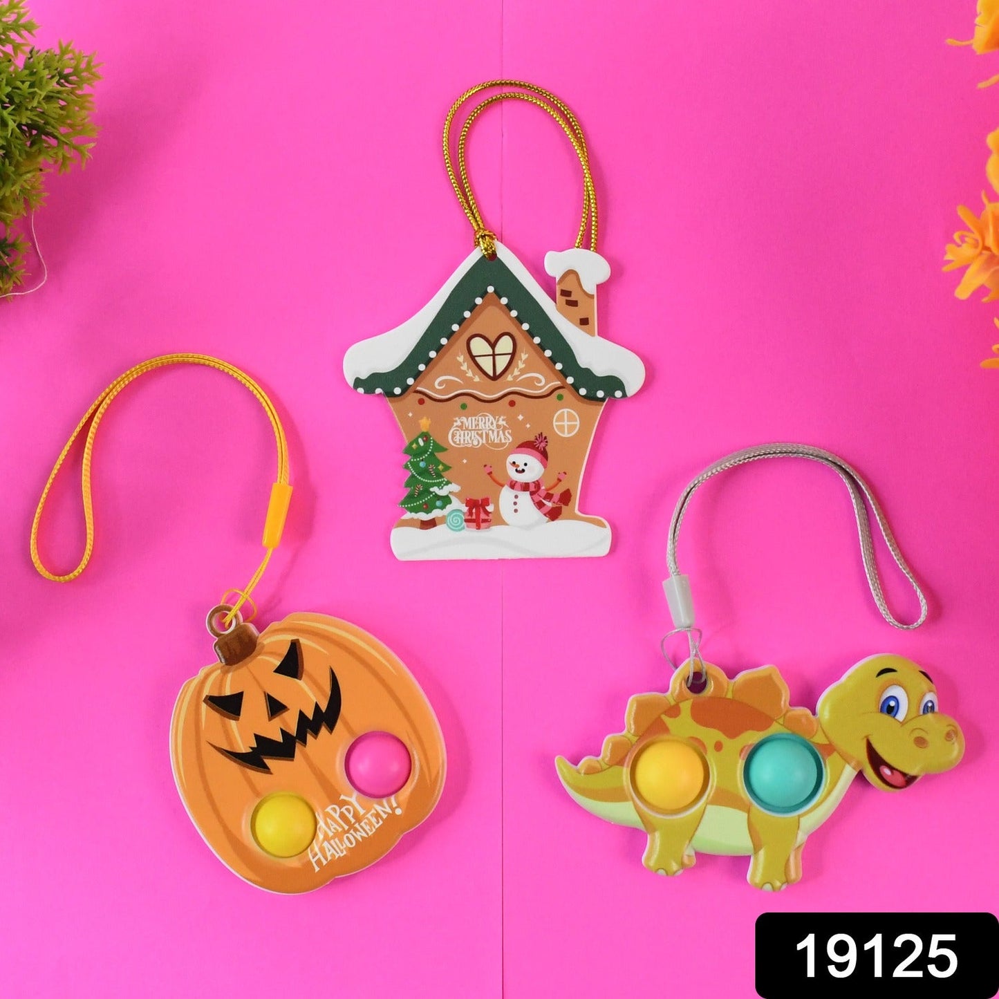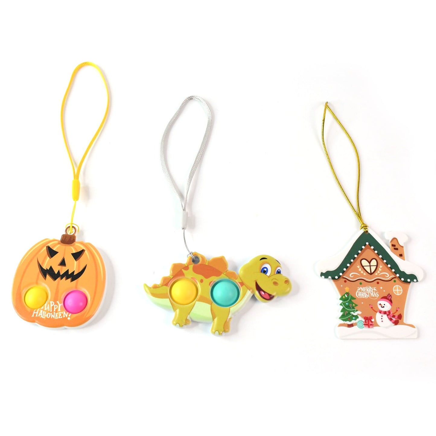 Delight kids and pop-toy lovers with this vibrant and festive push pop bubble keychain toy combo featuring three unique cartoon shapes – a Halloween pumpkin, a Merry Christmas snow house, and a smiling dinosaur. Made from safe, BPA-free silicone with a firm ABS base, each toy has popping bubbles for stress relief and sensory fun. These toys double up as quirky keychains or bag tags with their included loop straps, making them perfect for gifts, party favors, or everyday play. Enjoy both fun and function in one compact, lightweight toy that’s perfect on the go!
